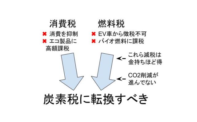 そこで、消費税・ガソリン税を減税するか?否か?という短絡的な議論に終始するのではなく、欧州などで急速に進んでいる炭素税への転換を早急に進めることを提案します。